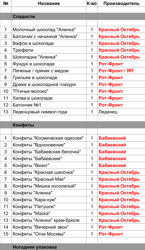 Молочный шоколад "Аленка" (1 шт), Батончик с начинкой "Аленка" (1 шт), Вафли в шоколаде (1 шт), Трюфели (1 шт), Шоколадка "Аленка" (1 шт), Конфеты "Красная шапочка" (1 шт), Конфеты "Красный Мак" (1 шт), Конфеты "Мишка косолапый" (1 шт), Конфеты "Аленка" (1 шт), Конфеты "Кара-кум" (1 шт), Конфеты "Петушок" (1 шт), Конфеты "Маска" (1 шт), Конфеты "Аленка" крем-брюле (1 шт)